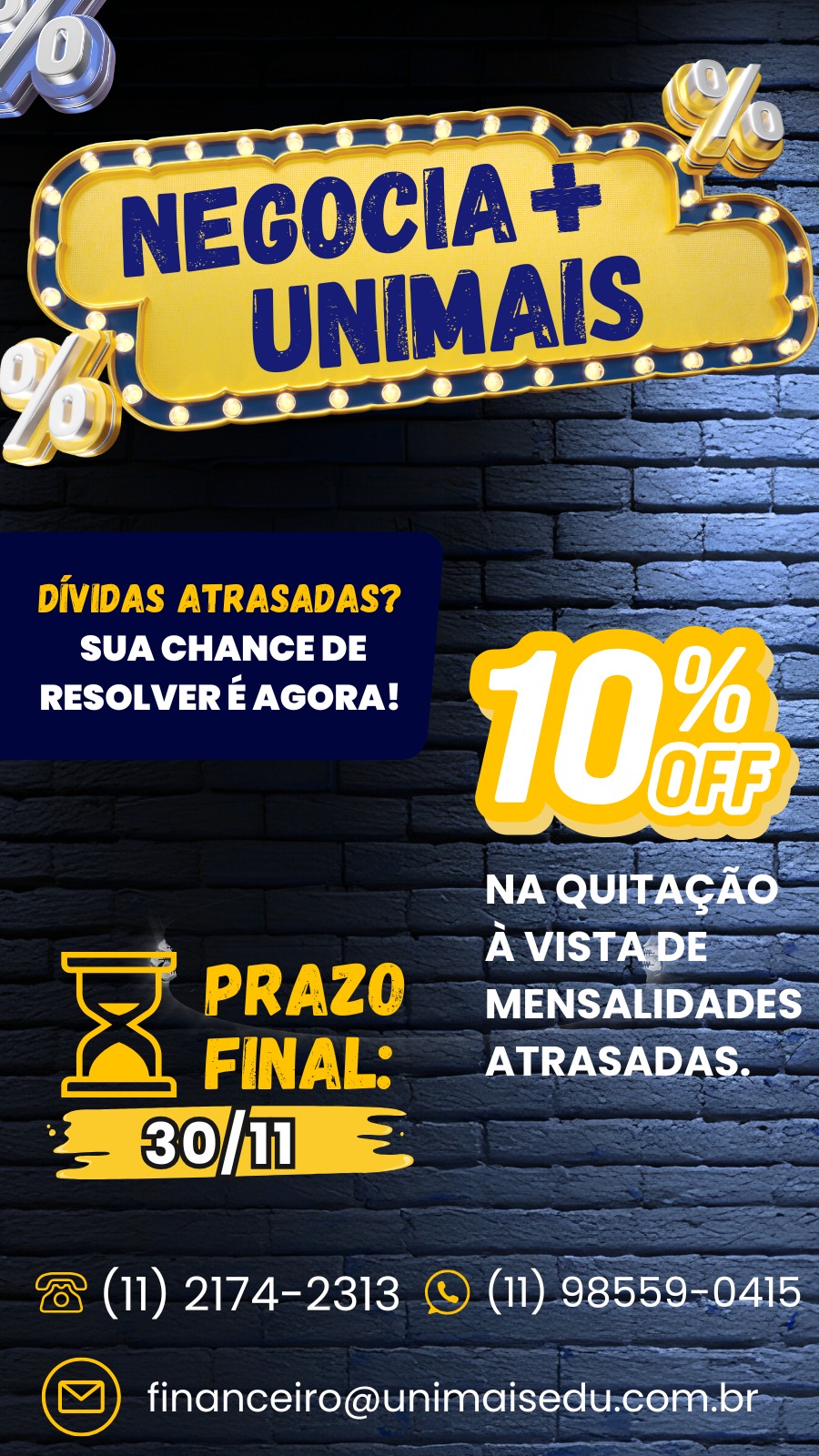 Diante do ocorrido, a Faculdade Unimais será a única responsável por todas as questões acadêmicas e financeiras de sua pós-graduação.